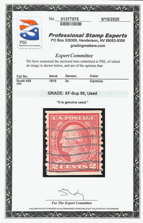7210 O 455 image1915, 2¢ carmine, type III, S.L. watermark, rotary press coil, perf. 10 vertically (Scott 455), Extremely Fine to Superb, with 2020 P.S.E. certificate graded XF-SUP 95.
