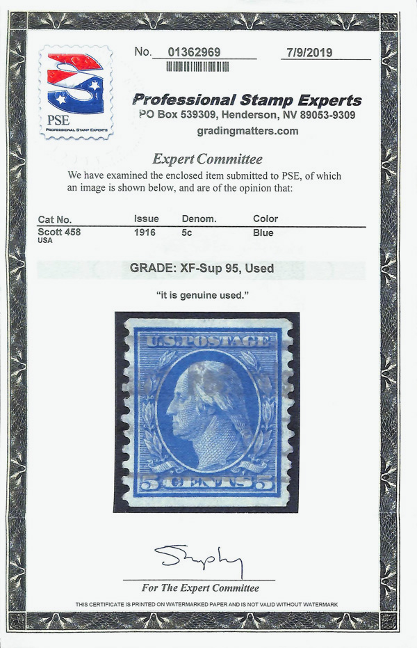 7211 O 458 image1916, 5¢ blue, S.L. watermark, rotary press coil, perf. 10 vertically (Scott 458), Extremely Fine to Superb, with 2019 P.S.E. certificate graded XF-SUP 95.