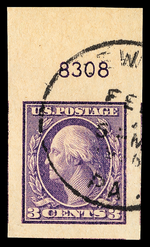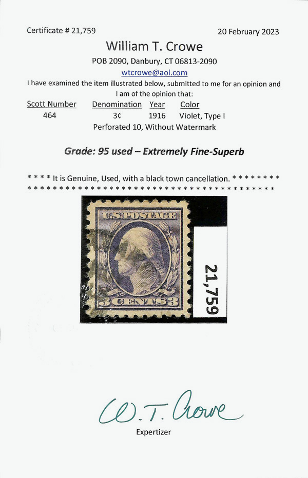 7213 O 464 image1916, 3¢ violet, type I, unwatermarked, perf. 10 (Scott 464), Extremely Fine to Superb, with 2023 Crowe certificate graded XF-SUP 95.