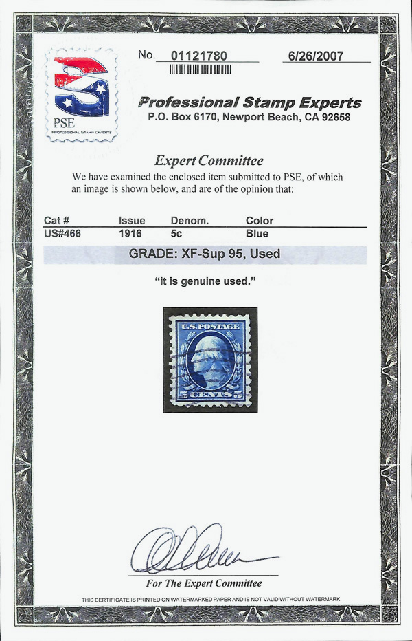 7215 O 466 image1916, 5¢ blue, unwatermarked, perf. 10 (Scott 466), Extremely Fine to Superb, with 2007 P.S.E. certificate graded XF-SUP 95.