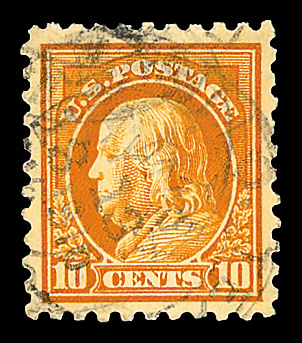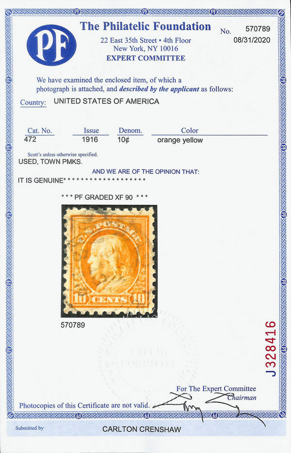 7219 O 472 image1916, 10¢ orange yellow, unwatermarked, perf. 10 (Scott 472), Extremely Fine, with 2020 P.F. certificate graded XF 90.