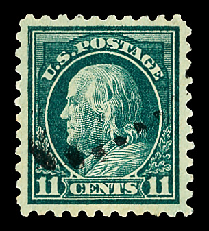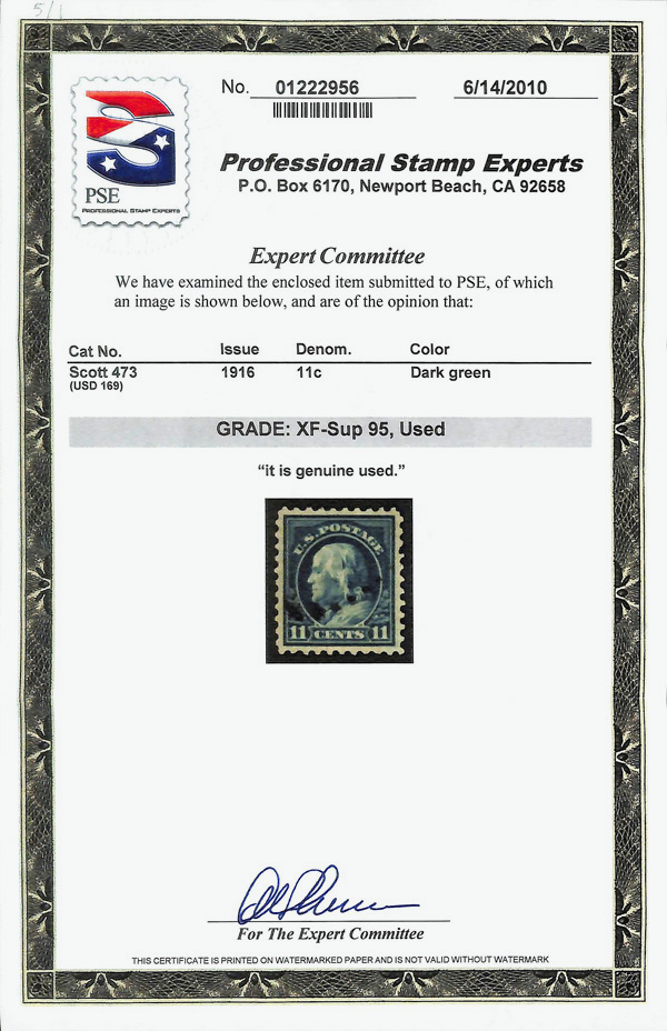 7220 O 473 image1916, 11¢ dark green, unwatermarked, perf. 10 (Scott 473), Extremely Fine to Superb, with 2010 P.S.E. certificate graded XF-SUP 95.