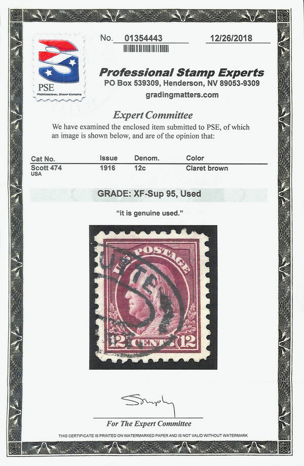 7221 O 474 image1916, 12¢ claret brown, unwatermarked, perf. 10 (Scott 474), Extremely Fine to Superb, with 2018 P.S.E. certificate graded XF-SUP 95.