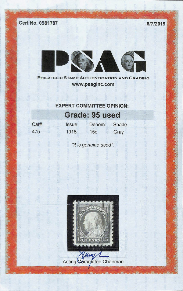 7222 O 475 image1916, 15¢ gray, unwatermarked, perf. 10 (Scott 475), Extremely Fine to Superb, with 2019 P.S.A.G. certificate graded XF-SUP 95.