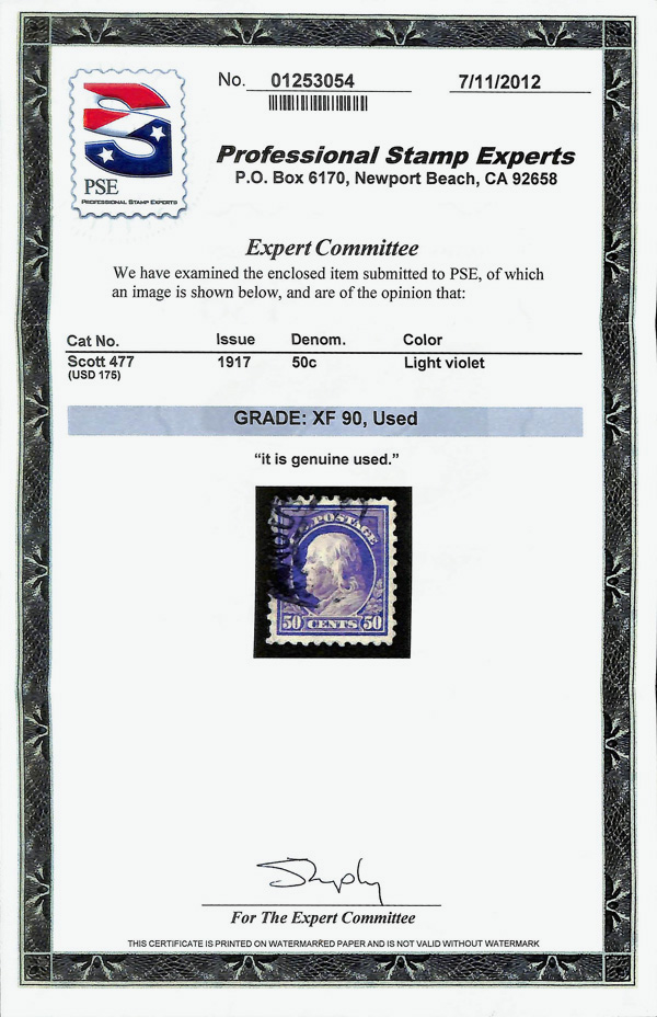 7223 O 477 image1917, 50¢ light violet, unwatermarked, perf. 10 (Scott 477), Extremely Fine, with 2012 P.S.E. certificate graded XF 90.