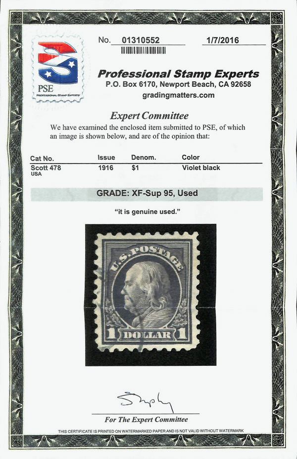 7224 O 478 image1916, $1 violet black, unwatermarked, perf. 10 (Scott 478), Extremely Fine to Superb, with 2016 P.S.E. certificate graded XF-SUP 95.