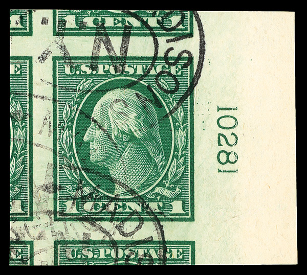 7226 O 481 image1916, 1¢ green, unwatermarked, imperf. (Scott 481), plate number single, jumbo margins with parts of 5 adjoining stamps., Superb, with 2008 P.S.E. certificate graded GEM 100J. (Image) (Image2) (All Images)