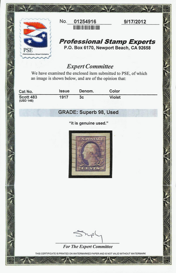 7229 O 483 image1917, 3¢ violet, type I, unwatermarked, imperf. (Scott 483), Superb, with 2012 P.S.E. certificate graded SUP 98.