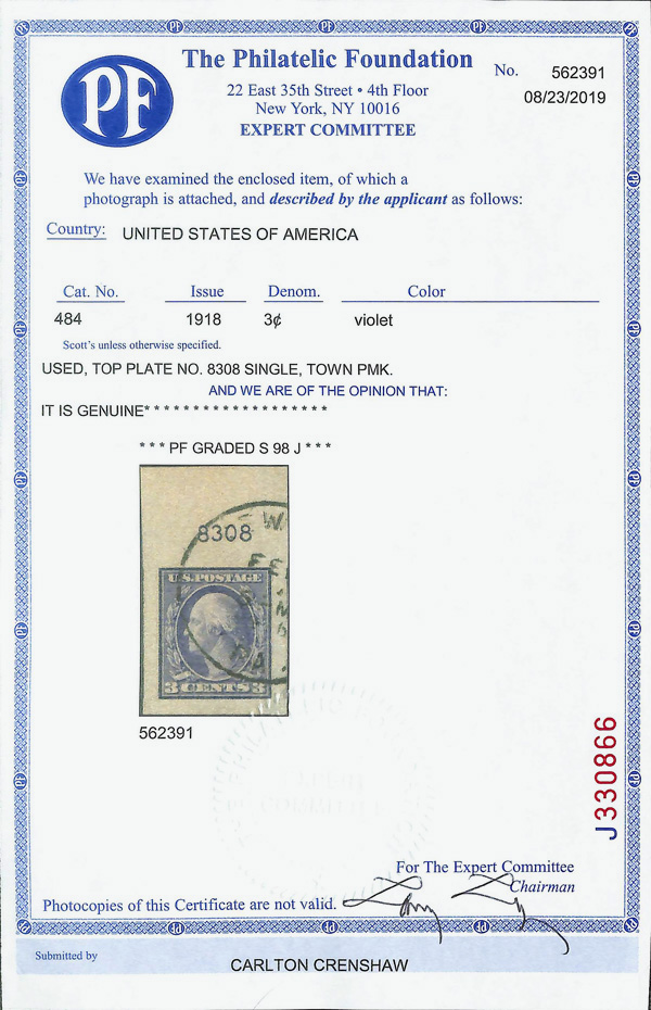 7231 O 484 image1916, 3¢ violet, type II, unwatermarked, imperf. (Scott 484), plate number single, Superb, with 2019 P.F. certificate graded SUP 98J. (Image) (Image2) (All Images)