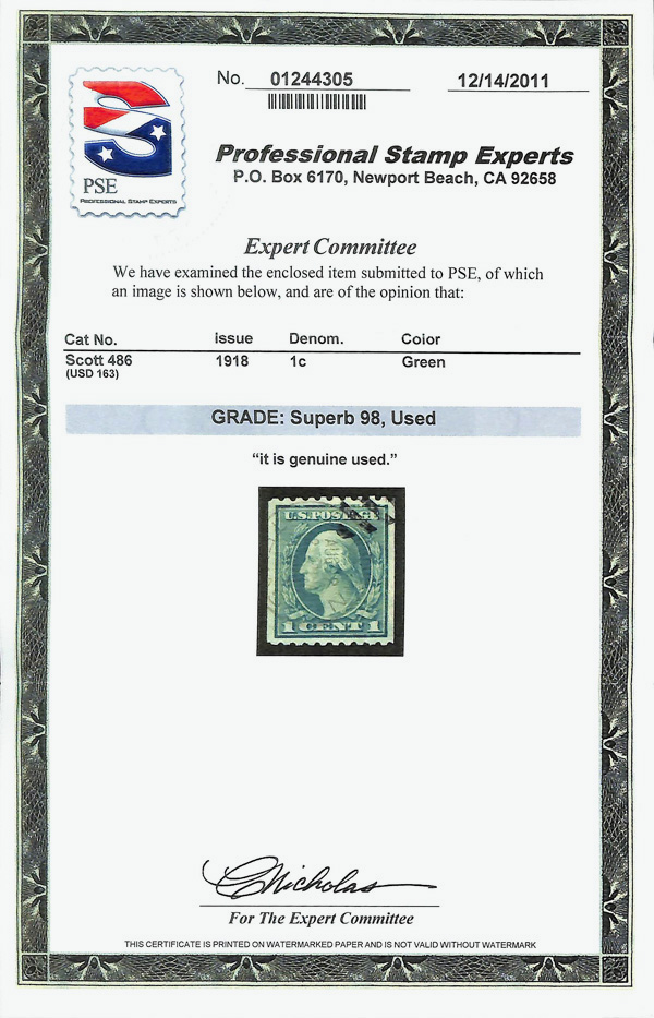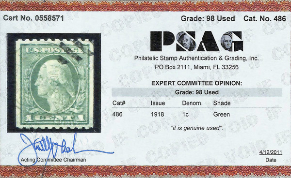 7234 O 486 image1918, 1¢ green, unwatermarked, rotary press coil, perf. 10 horizontally (Scott 486), Superb, with 2011 P.S.E. certificate graded SUP 98.