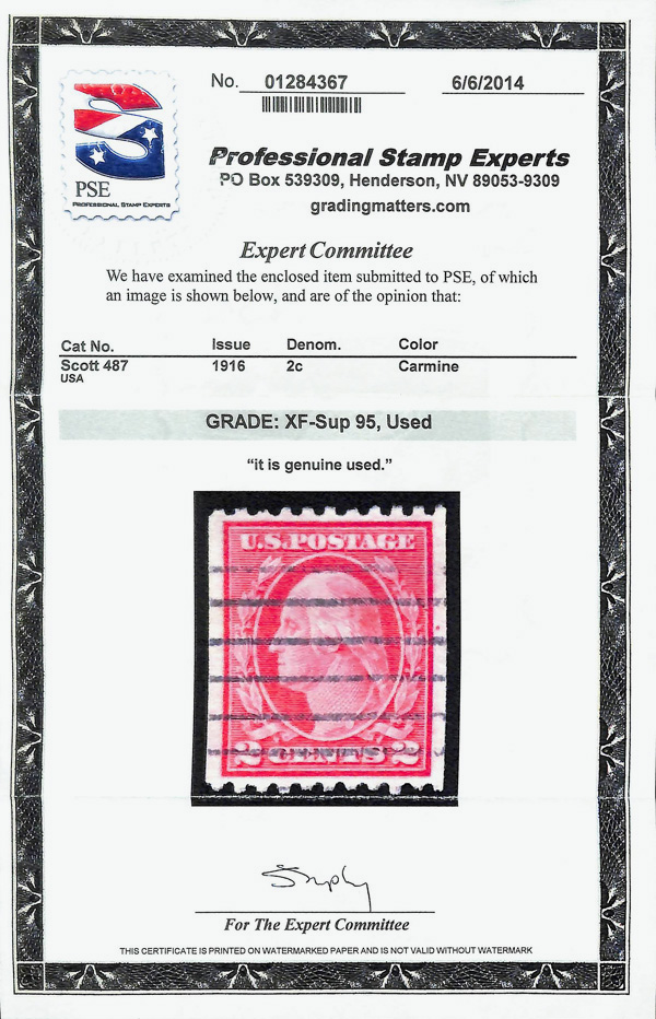 7239 O 487 image1916, 2¢ carmine, type II, unwatermarked, rotary press coil, perf. 10 horizontally (Scott 487), Extremely Fine to Superb, with 2014 P.S.E. certificate graded XF-SUP 95.