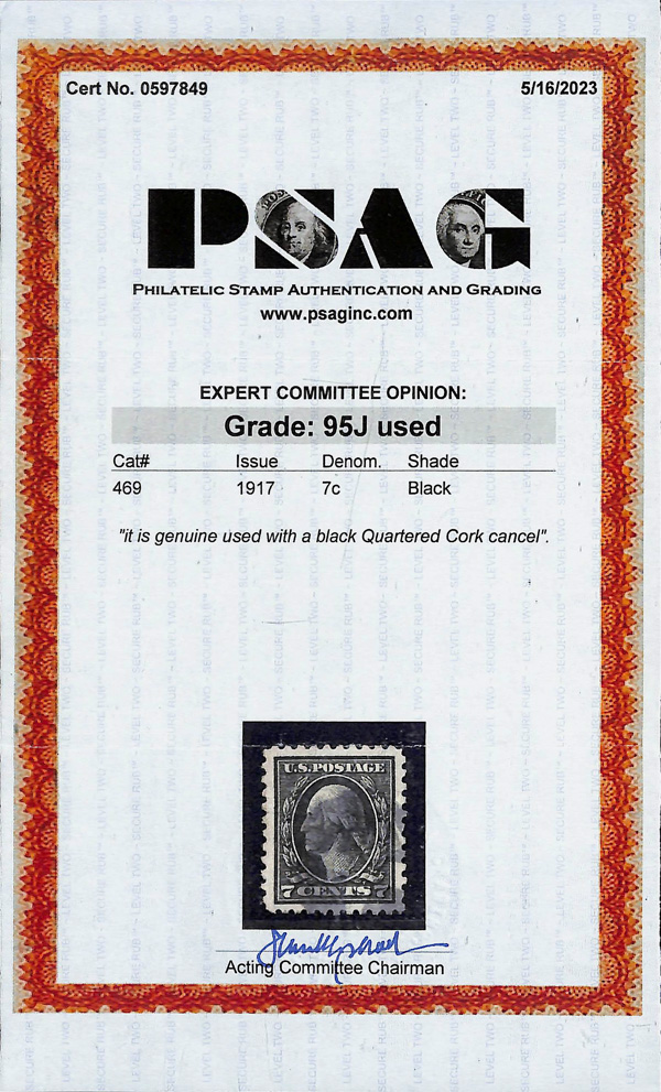 7217 O 469 image1916, 7¢ black, unwatermarked, perf. 10 (Scott 469), an eye-catching jumbo with proof-like presentation on bright white paper, sound with interesting cancel, Extremely Fine to Superb, SMQ for a 98 $750, no stamps recorded at this grade in PSE's Population Report, with just two higher, with 2023 P.S.A.G. certificate graded XF-SUP 95J.