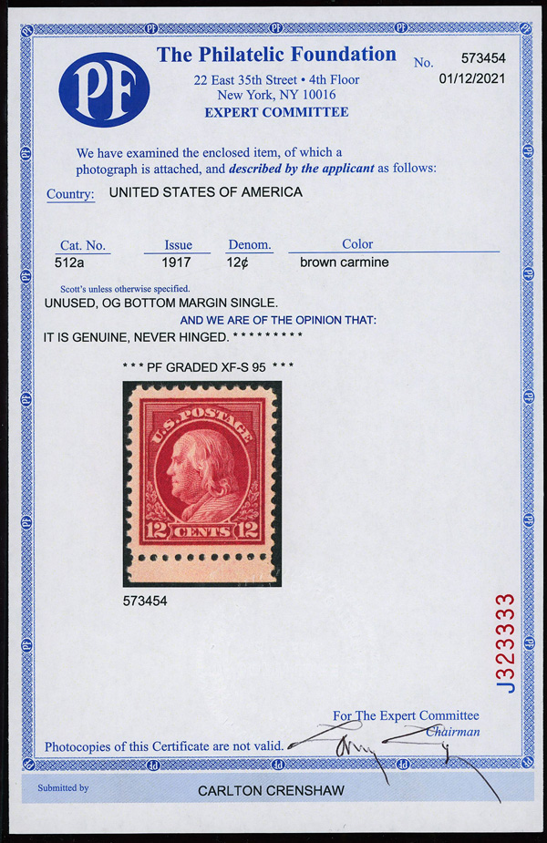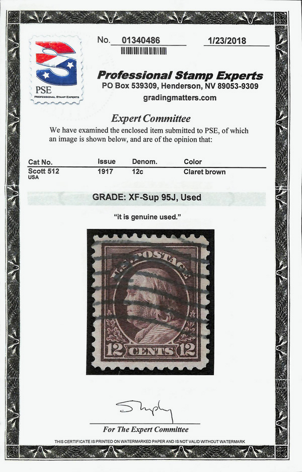 7283 O 512 image1917, 12¢ claret brown, perf. 11 (Scott 512), jumbo margins, Extremely Fine to Superb, with 2018 P.S.E. certificate graded XF-SUP 95J.