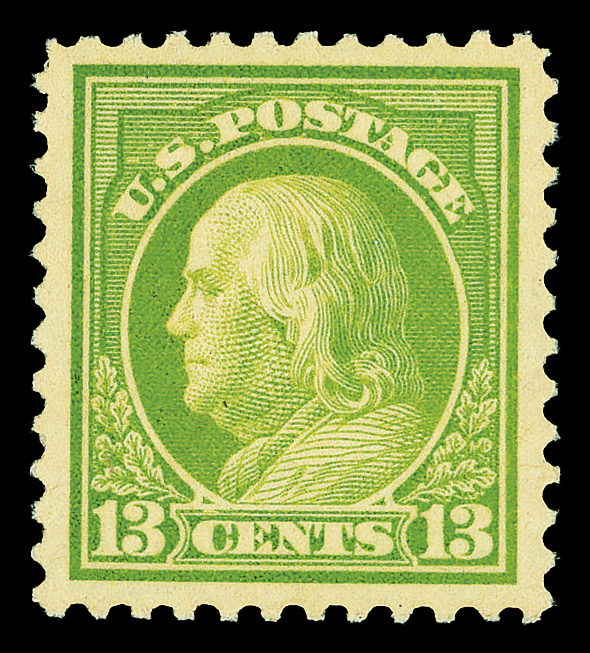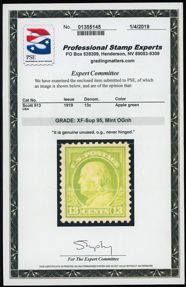 7285 nh 513 image1919, 13¢ apple green, perf. 11 (Scott 513), o.g., never hinged, Extremely Fine to Superb, with 2019 P.S.E. certificate graded XF-SUP 95.