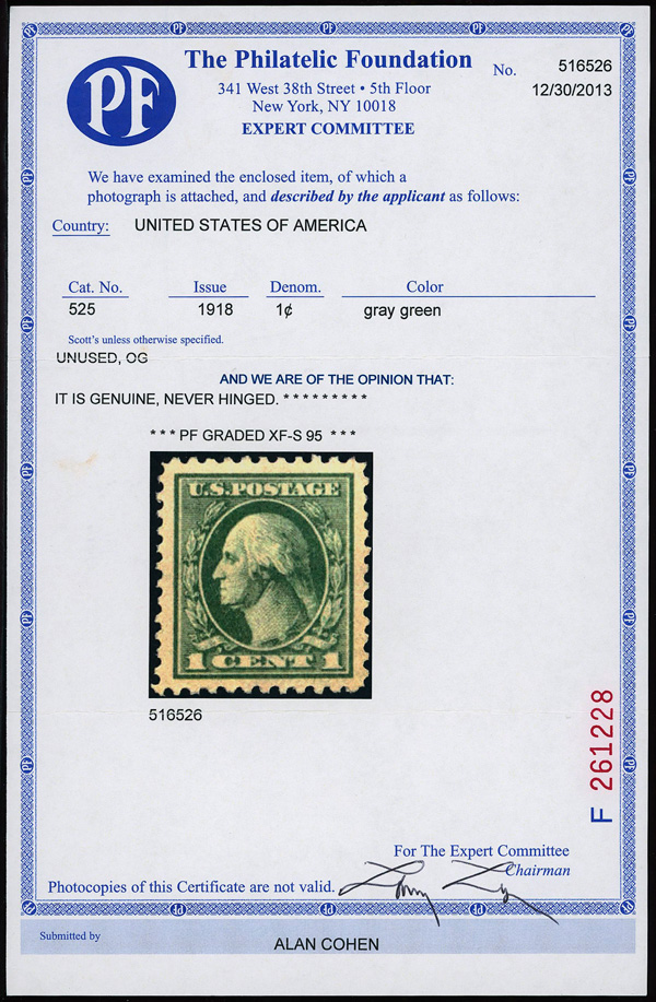 7293 nh 525 image1918, 1¢ gray green, offset printing (Scott 525), o.g., never hinged, Extremely Fine to Superb, with 2013 P.F. certificate graded XF-SUP 95.