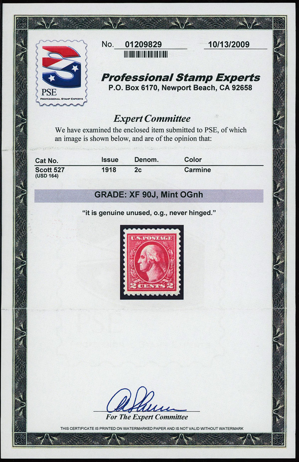 7296 nh 527 image1918, 2¢ carmine, type V, offset printing (Scott 527), o.g., never hinged, jumbo margins, Extremely Fine, with 2009 P.S.E. certificate graded XF 90J.