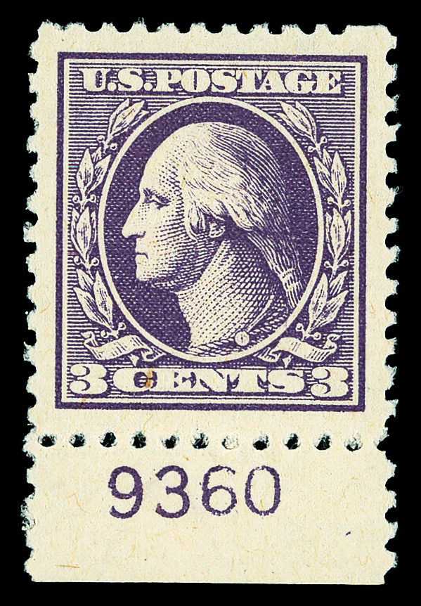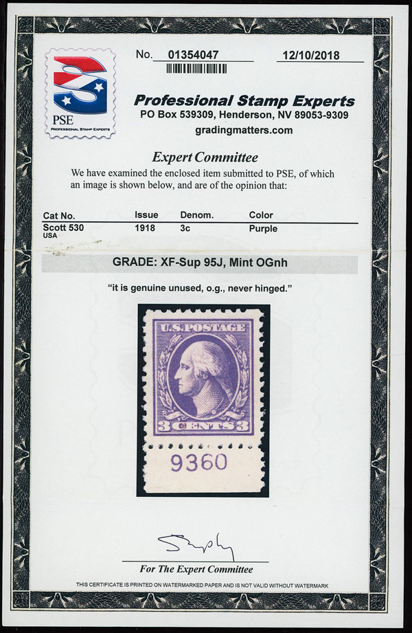 7303 nh 530 image1918, 3¢ purple, type IV, offset printing (Scott 530), plate number single, o.g., never hinged, jumbo margins, Extremely Fine to Superb, with 2018 P.S.E. certificate graded XF-SUP 95J.