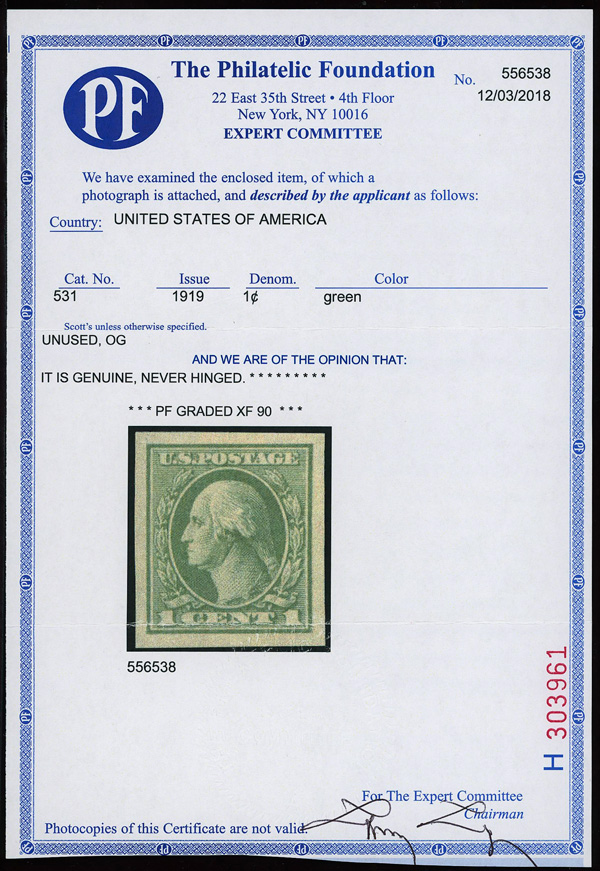 7305 nh 531 image1919, 1¢ green, offset printing, imperf. (Scott 531), o.g., never hinged, Extremely Fine, with 2018 P.F. certificate graded XF 90.