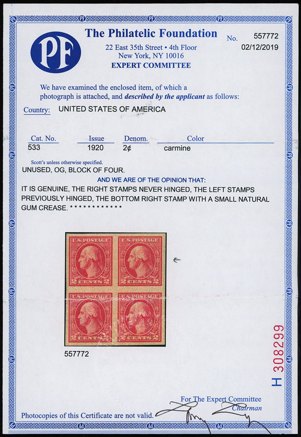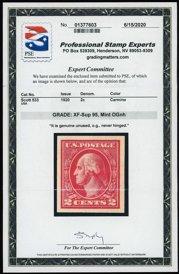 7307 nh 533 image1918, 2¢ carmine, type V, offset printing, imperf. (Scott 533), o.g., never hinged, Extremely Fine to Superb, with 2020 P.S.E. certificate graded XF-SUP 95.