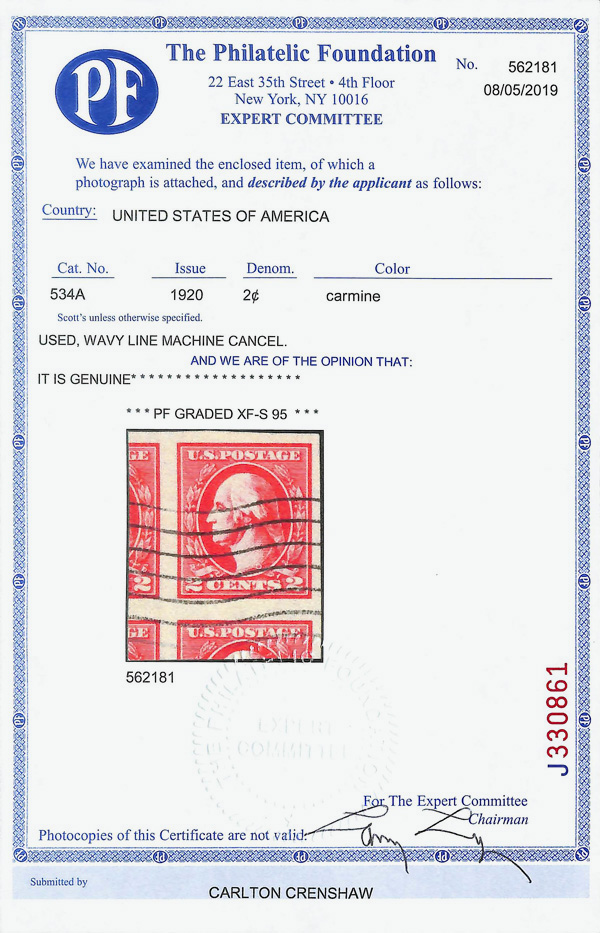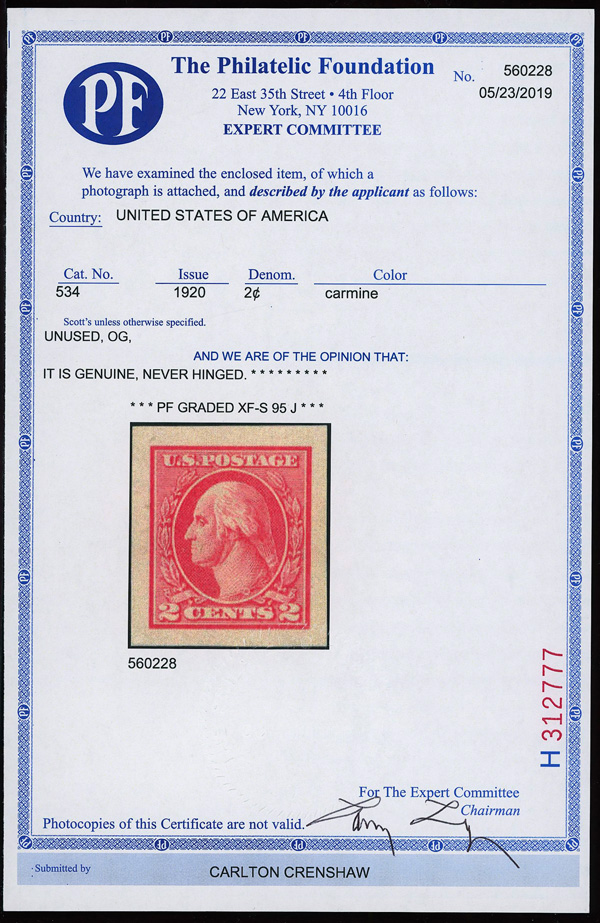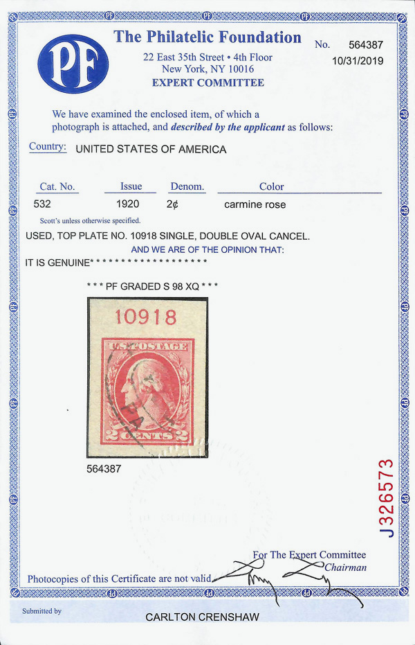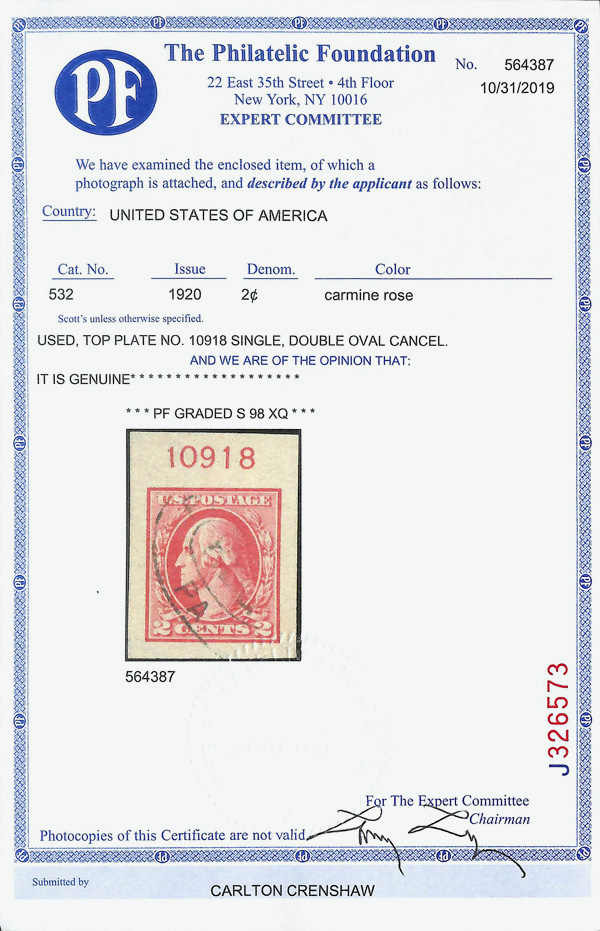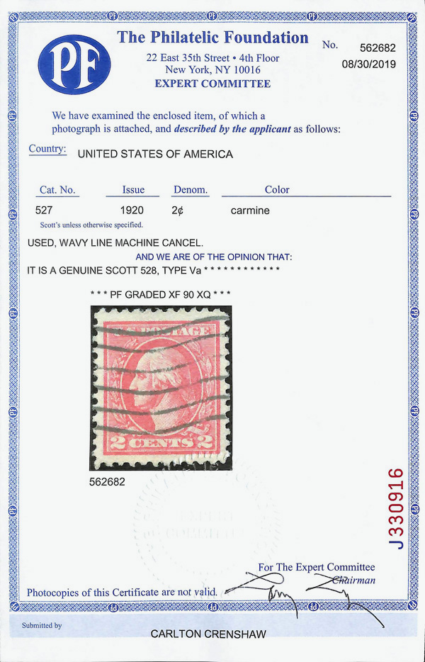 7297 O 527 image1918, 2¢ carmine, type V, offset printing (Scott 527), Extremely Fine, with 2019 P.F. certificate graded XF 90 XQ.