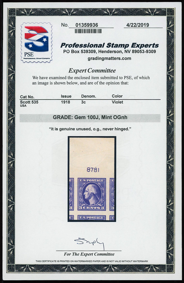 7310 nh 535 image1918, 3¢ violet, type V, offset printing, imperf. (Scott 535), plate number single, o.g., never hinged, jumbo margins with parts of 5 surrounding stamps, Superb no SMQ price, with 2019 P.S.E. certificate graded GEM 100J. (Image) (Image2) (All Images)