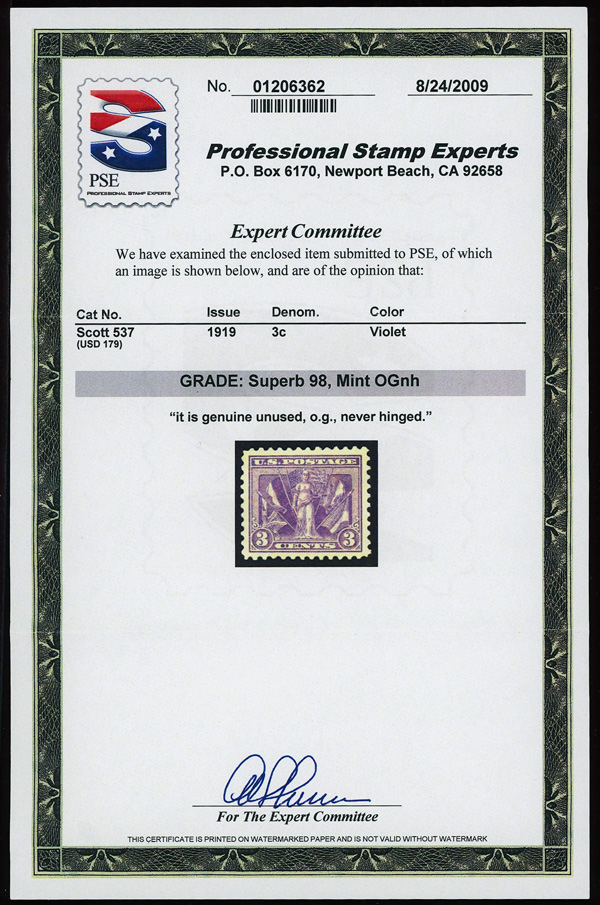 7312 nh 537 image1919, 3¢ Victory, violet (Scott 537), o.g., never hinged, Superb, with 2009 P.S.E. certificate graded SUP 98.