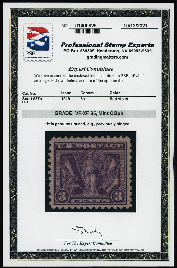 7314 og 537c image1919, 3¢ Victory, red violet (Scott 537c), o.g., lightly hinged, Very Fine to Extremely Fine, with 2021 P.S.E. certificate graded VF-XF 85.