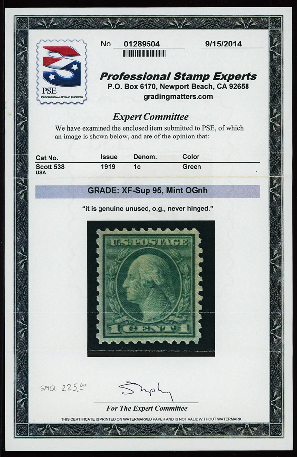 7315 nh 538 image1919, 1¢ green, rotary press coil waste, perf. 11 x 10 (Scott 538), o.g., never hinged, Extremely Fine to Superb, with 2014 P.S.E. certificate graded XF-SUP 95.