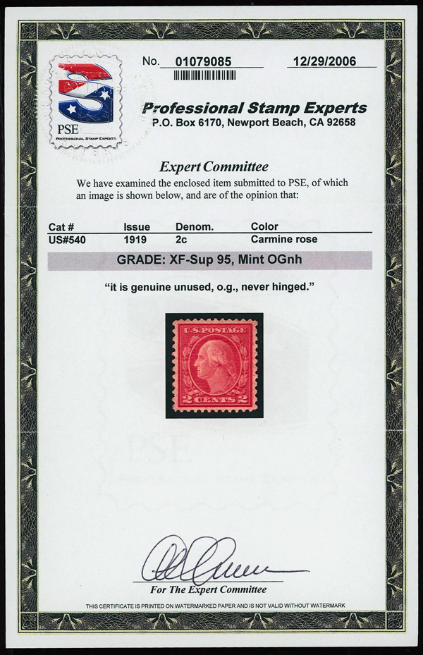 7317 nh 540 image1919, 2¢ carmine rose, type II, rotary press coil waste, perf. 11 x 10 (Scott 540), o.g., never hinged, Extremely Fine to Superb, with 2006 P.S.E. certificate graded XF-SUP 95.