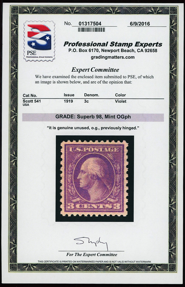 7320 og 541 image1919, 3¢ violet, rotary press coil waste, type II, perf. 11 x 10 (Scott 541), o.g., invisibly hinged, Superb, with 2016 P.S.E. certificate graded SUP 98.