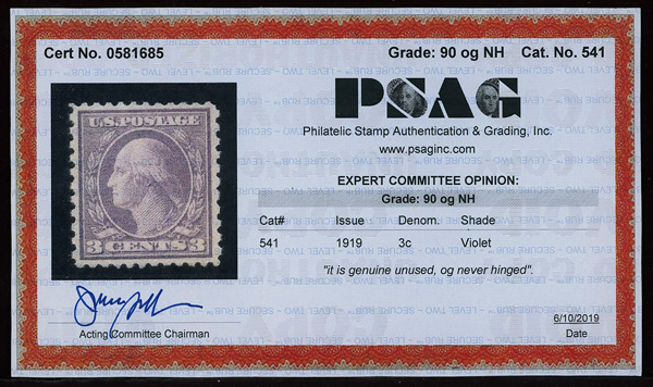 7319 nh 541 image1919, 3¢ violet, rotary press coil waste, type II, perf. 11 x 10 (Scott 541), o.g., never hinged, Extremely Fine, with 2019 P.S.A.G. certificate graded XF 90.