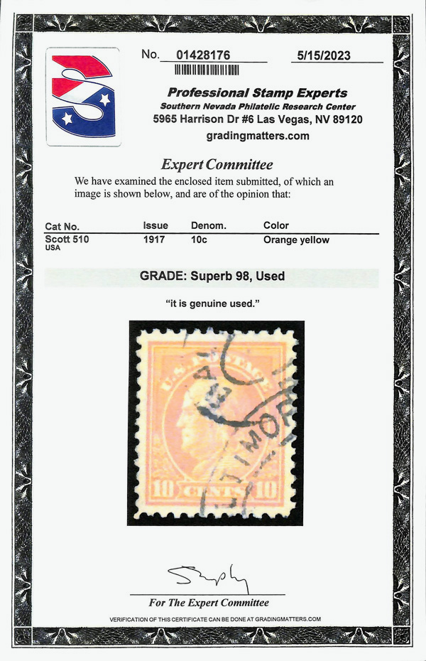7281 O 510 image1917, 10¢ orange yellow, perf. 11 (Scott 510), Superb, with 2023 P.S.E. certificate graded SUP 98.