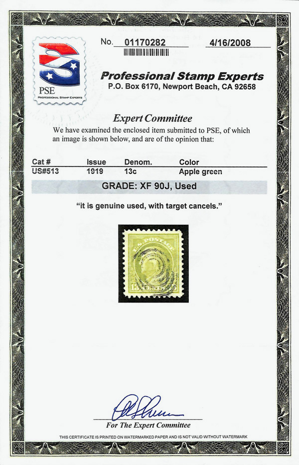 7286 O 513 image1919, 13¢ apple green, perf. 11 (Scott 513), jumbo margin, Extremely Fine, with 2008 P.S.E. certificate graded XF 90J.