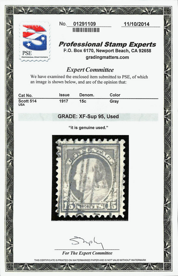 7287 O 514 image1917, 15¢ gray, perf. 11 (Scott 514), Extremely Fine to Superb, with 2014 P.S.E. certificate graded XF-SUP 95.