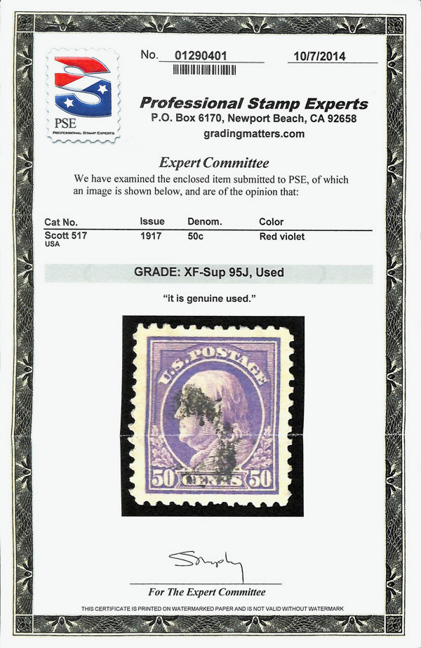 7289 O 517 image1917, 50¢ red violet, perf. 11 (Scott 517), jumbo margins, Extremely Fine to Superb, with 2014 P.S.E. certificate graded XF-SUP 95J.