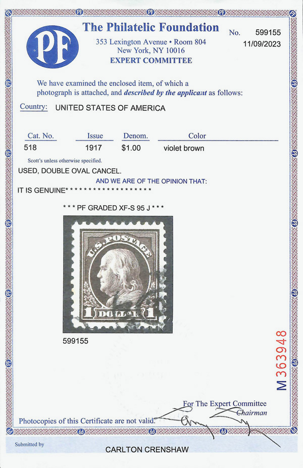 7290 O 518 image1917, $1 violet brown, perf. 11 (Scott 518), jumbo margins, Extremely Fine to Superb, with 2023 P.F. certificate graded XF-SUP 95J.