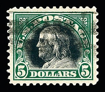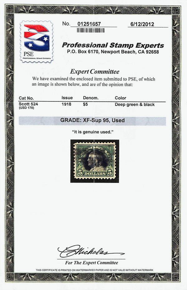 7292 O 524 image1918, $5 deep green & black (Scott 524), Extremely Fine to Superb, with 2012 P.S.E. certificate graded XF-SUP 95.