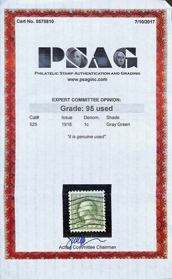 7294 O 525 image1918, 1¢ gray green, offset printing (Scott 525), Extremely Fine to Superb, with 2017 P.S.A.G. certificate graded XF-SUP 95.