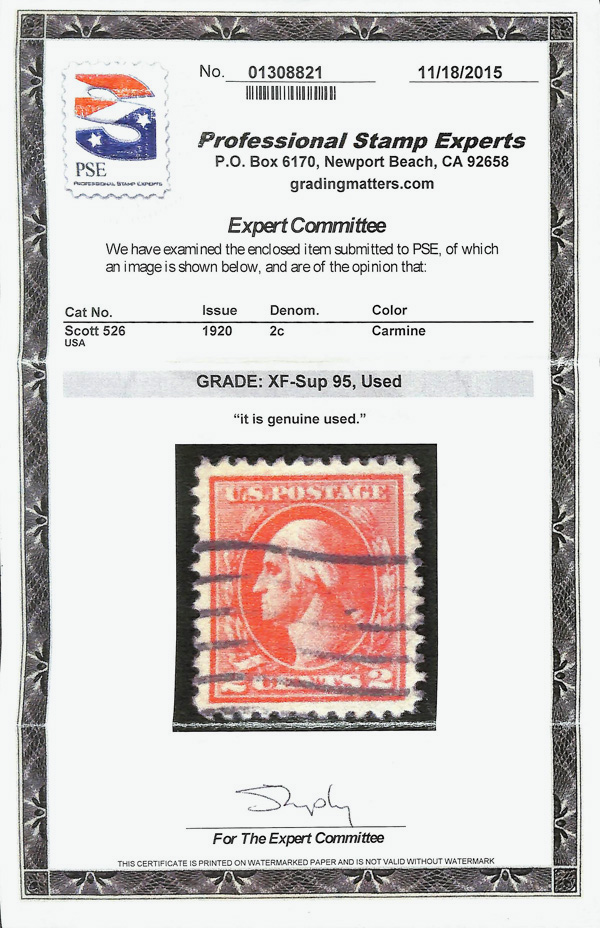 7295 O 526 image1920, 2¢ carmine, type IV, offset printing (Scott 526), Extremely Fine to Superb, with 2015 P.S.E. certificate graded XF-SUP 95.