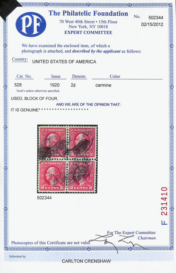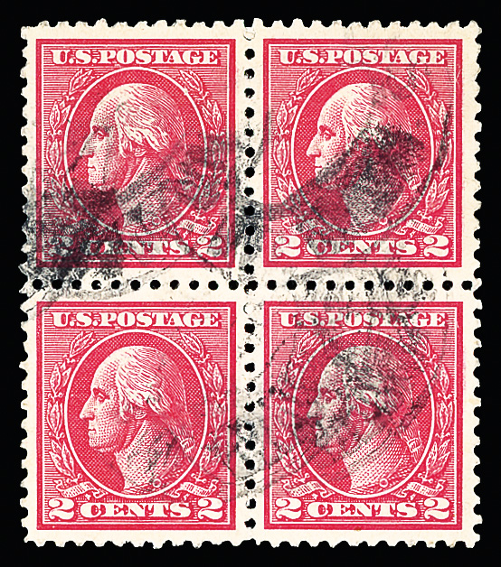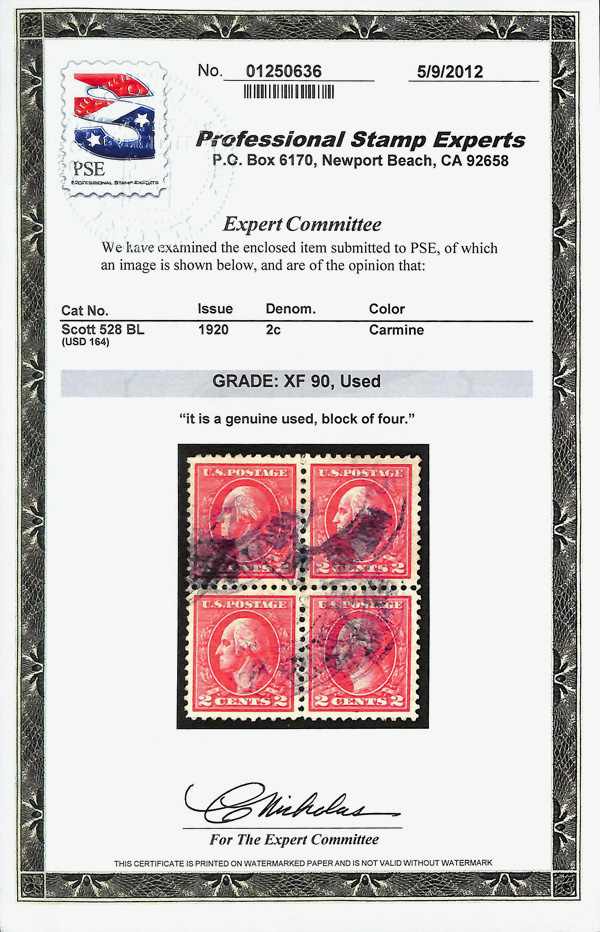 7298 Obl 528 image1918, 2¢ carmine, type Va, offset printing (Scott 528), block of 4, Extremely Fine, with 2012 P.S.E. certificate graded XF 90.