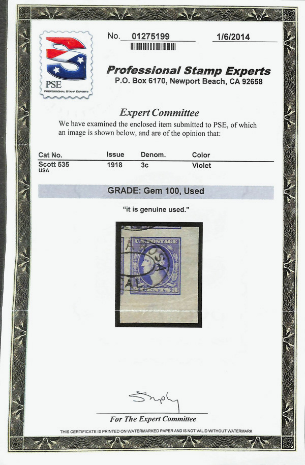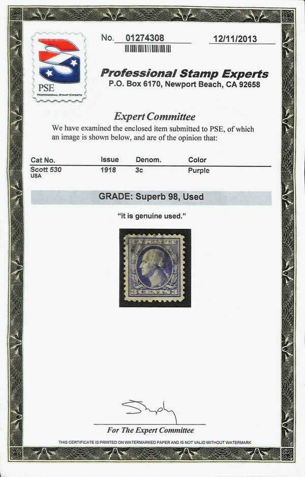 7304 O 530 image1918, 3¢ purple, type IV, offset printing (Scott 530), Superb, with 2013 P.S.E. certificate graded SUP 98.