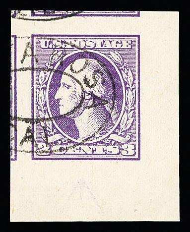 7311 O 535 image1918, 3¢ violet, type V, offset printing, imperf. (Scott 535), corner margin single, with small parts of 3 adjoining stamps., Superb, with 2014 P.S.E. certificate graded GEM 100.