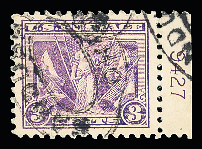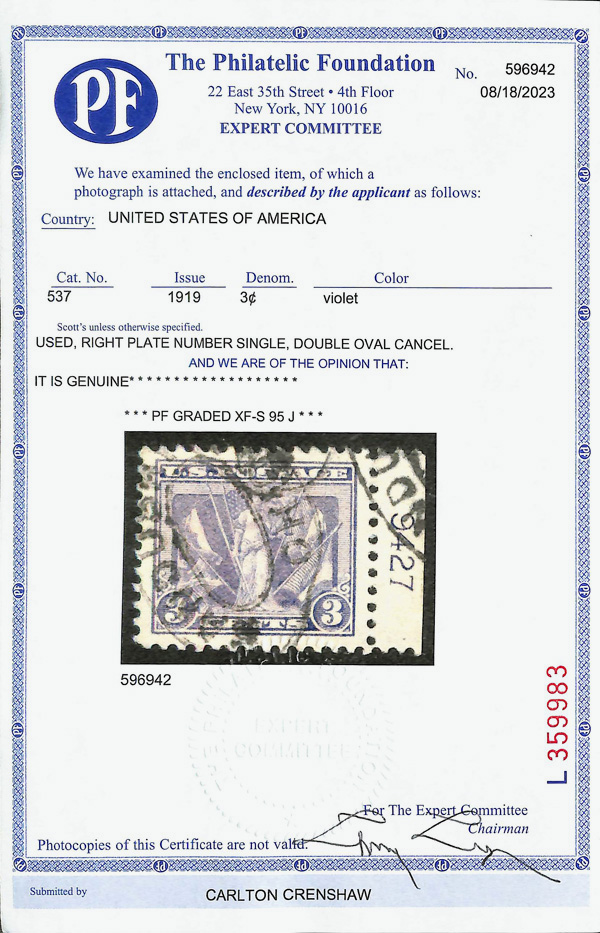 7313 O 537 image1919, 3¢ Victory, violet (Scott 537), plate number single, jumbo margins, Extremely Fine to Superb, with 2023 P.F. certificate graded XF-SUP 95J.