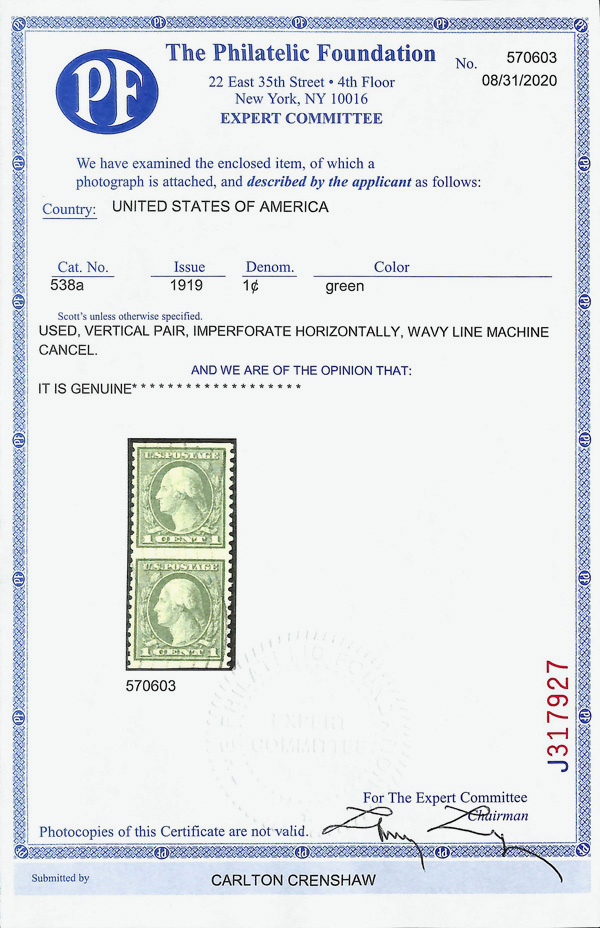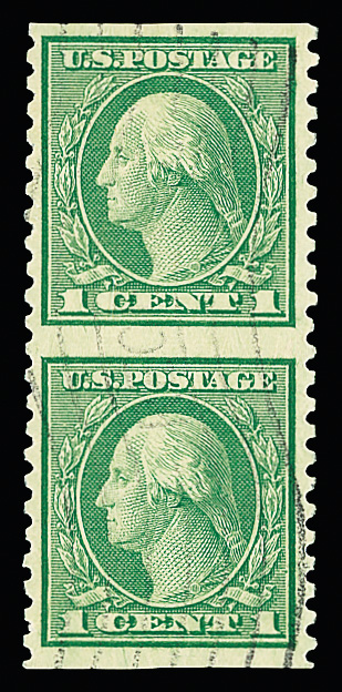 7316 O 538a image1919, 1¢ green, rotary press coil waste, vertical pair, imperf. horizontally (Scott 538a), Very Fine, with 2020 P.F. certificate.