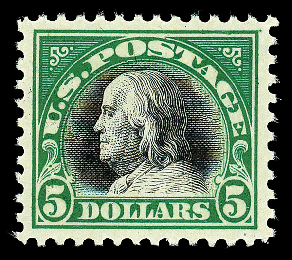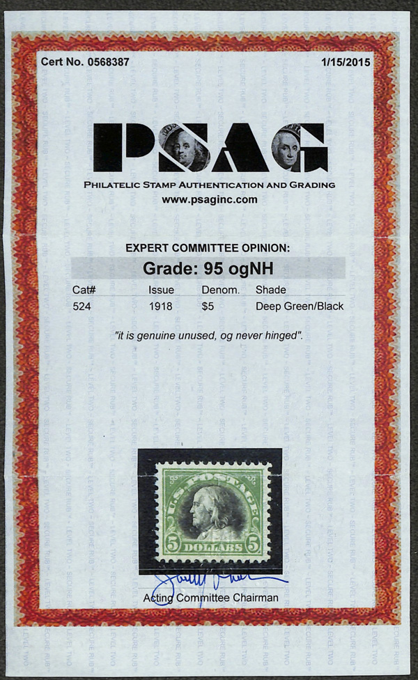 7291 nh 524 image1918, $5 deep green & black (Scott 524), o.g., never hinged, Post Office fresh with bright color on matching paper, vignette with deeply engraved lines, Extremely Fine to Superb, with 2015 P.S.A.G. certificate graded XF-SUP 95.