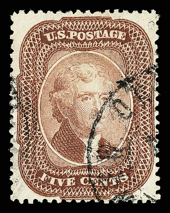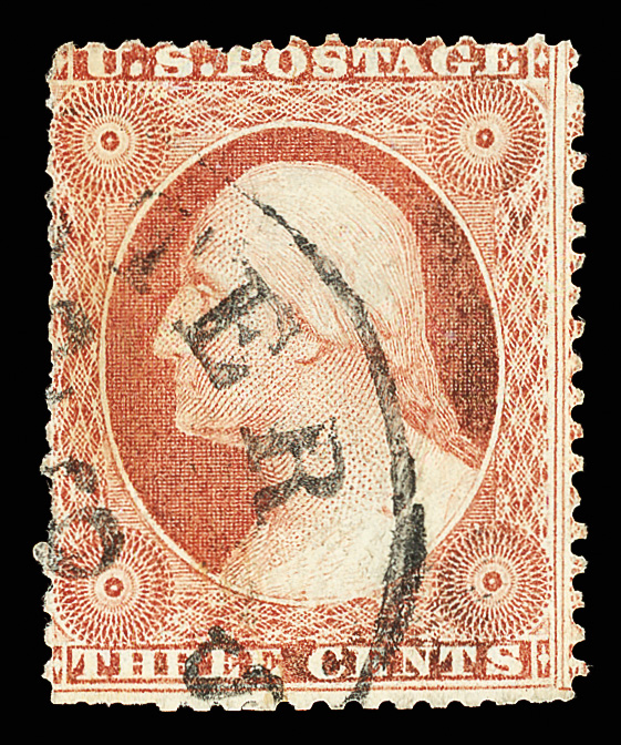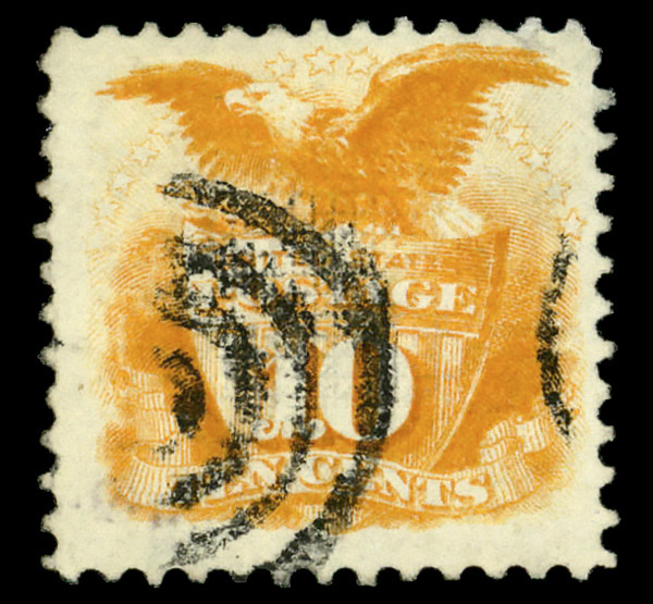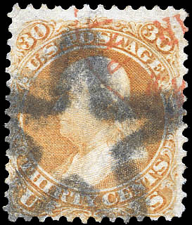 8023 O 100 image1867, 30¢ orange, F. grill (Scott 100), bright and clean with fresh color; circle-of-wedges cancel brings grill into relief at right; light crease, Fine.