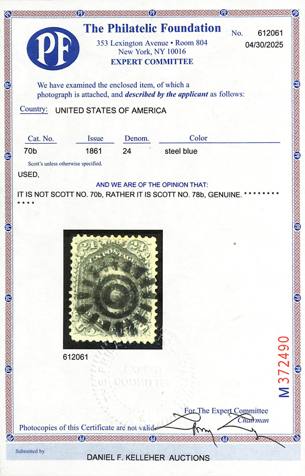 8018 O 78b image1863, 24¢ gray (Scott 78b), with well-struck San Francisco cogwheel cancel, lovely dark shade on fresh paper with long full perforations all around, Very Fine, with 2025 P.F. certificate.