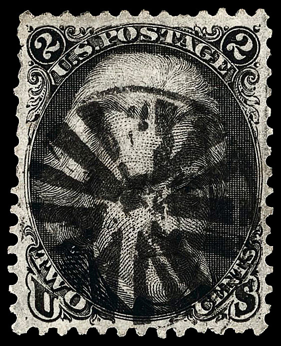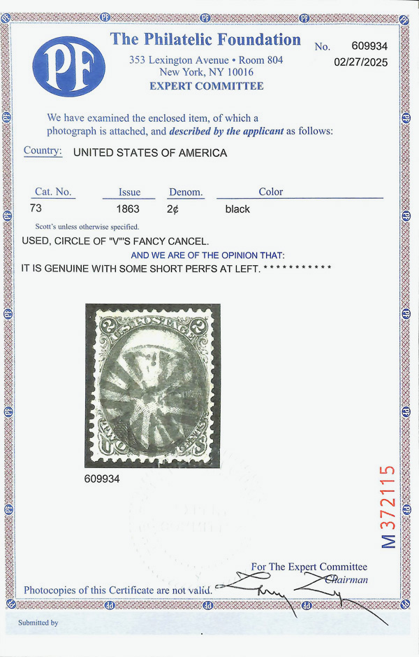 8015 O 73 image1863, 2¢ black (Scott 73), circle of 'V's fancy cancel; short perfs at left, Very Fine to Extremely Fine, with 2025 P.F. certificate.