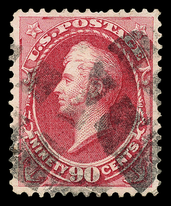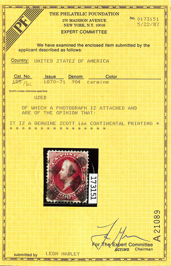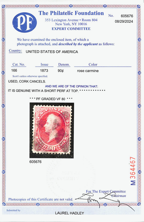 8038 O 166 image1873, 90¢ rose carmine, C.B.N.C. printing (Scott 166), Intense strong strike, cork cancels; short perf at top, Very Fine, with 2024 P.F. certificate graded VF 80 and 1987 P.F. certificate.
