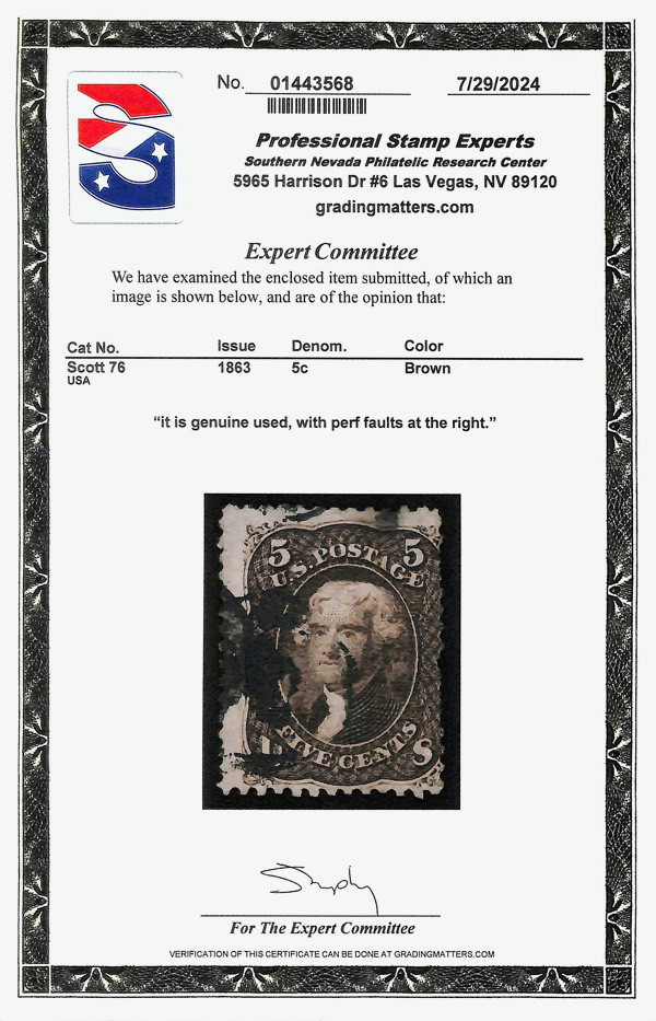 8016 O 76 image1863, 5¢ brown (Scott 76), single; Perforation faults right side, Fine, with 2024 P.S.E. certificate.